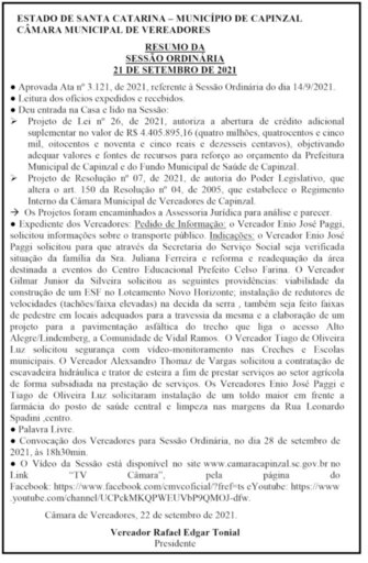 - Projeto de Lei nº 26 de 2021, autoriza a abertura de crédito adicional suplementar no valor de R $ 4.405.895,16 (quatro milhões, quatrocentos e cinco mil, oitocentos e noventa e cinco reais e dezesseis centavos), objetivando valores adequados e fontes de recursos para reforço ao orçamento da Prefeitura Municipal de Capinzal e do Fundo Municipal de Saúde de Capinzal.