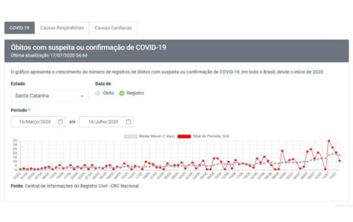 Os cartórios de Santa Catarina registraram 626 óbitos por suspeita ou confirmação de Covid-19 de 16 de março a 16 de julho de 2020, última data de atualização dos dados (as informações de 17/7 ainda não estão totalmente apuradas e/ou atualizadas no sistema). O balanço consta no Portal da Transparência do Registro Civil, uma ferramenta nacional alimentada por todos os cartórios do Brasil. Desde o início da pandemia do coronavírus o portal conta com uma aba especial para divulgar dados de mortes por covid-19, mortes por causas respiratórias e também por causas cardíacas. "O objetivo dessa divulgação foi conferir mais transparência a dados que são públicos, de forma a contribuir com estudos, projeções e tomadas de decisões por parte de gestores públicos, pesquisadores e profissionais da saúde", explica Rosina Deeke, presidente da Anoreg/SC, entidade que representa as serventias.