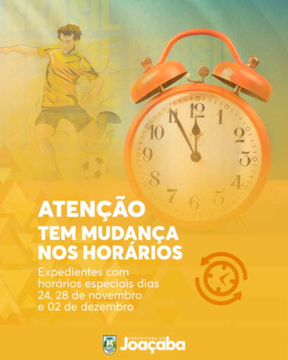 Para o dia 28 de novembro de 2022, dia de jogo da Seleção Brasileira de futebol, o horário de expediente no âmbito de todos os órgãos públicos municipais, compreendendo Prefeitura e Autarquias, será das 07h às 12h30min.