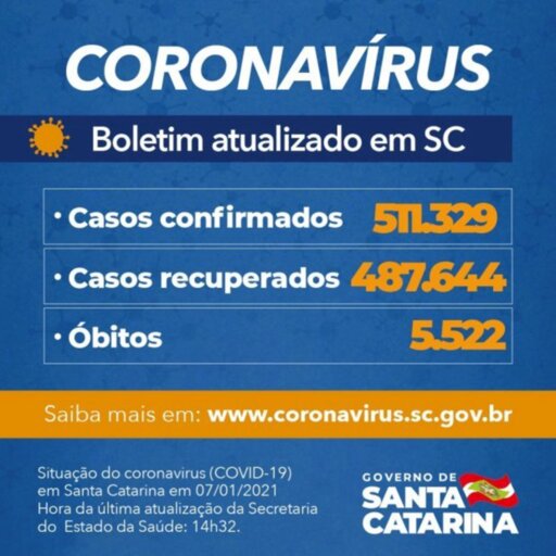 Coronavírus em SC: Estado confirma 511.329 casos, 487.644 recuperados e 5.522 mortes por Covid-19