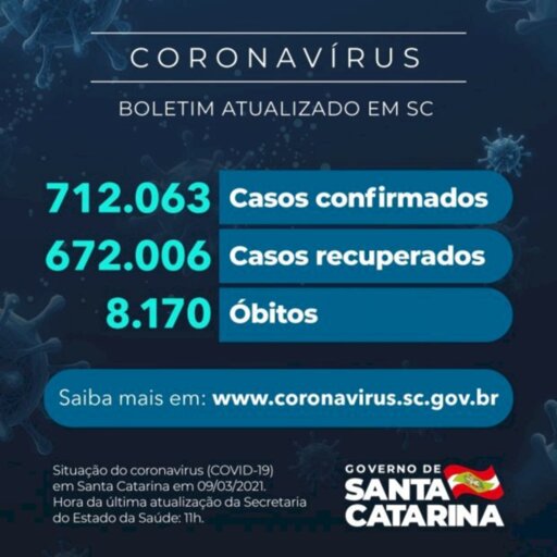 Coronavírus em SC: Estado confirma 712.063 casos, 672.006 recuperados e 8.170 mortes