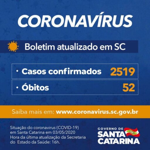 Arte / Secom - O Governo do Estado informa que há 2.519 casos confirmados de Covid-19 em Santa Catarina. O balanço foi divulgado neste domingo, 3. O novo coronavírus causou 52 óbitos no estado desde o início da pandemia.