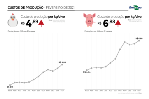 Os custos de produção de frango de corte e de suínos continuam subindo em 2021. Apenas em fevereiro, os custos para os frangos de corte aumentaram 6,89%, enquanto que para suínos a alta foi de 3,74% em relação a janeiro. Os números são da CIAS, a Central de Inteligência de Aves e Suínos da Embrapa, que disponibiliza as informações no site embrapa.br/suinos-e-ave/cias.