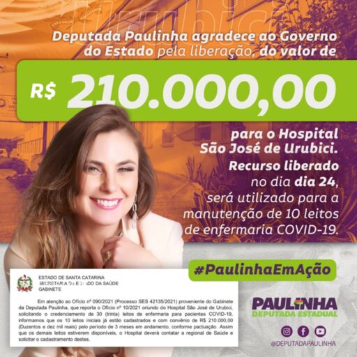 Deputada Paulinha informa que o Governo liberou R$ 210 mil para Hospital São José de Urubici