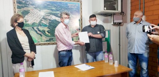 Fotos de Aldo Azevedo - Prefeito Nilvo Dorini entregando a ordem de serviço para Alexandre Caldeira, representante da empresa Triângulo Engenharia (de Treze Tílias/SC), vencedora da licitação.