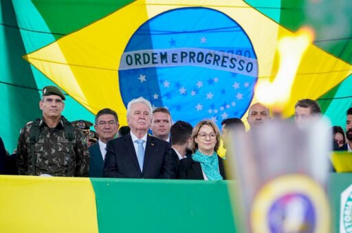 O desfile cívico-militar de 7 de setembro, que marca a comemoração do Bicentenário da Independência do Brasil, foi acompanhado na manhã desta quarta-feira, em Florianópolis, pelo governador em exercício, Moacir Sopelsa, 'junto da primeira-dama Valentina Sopelsa'. Apesar da chuva, a solenidade na Beira-Mar Continental, reuniu milhares de pessoas.