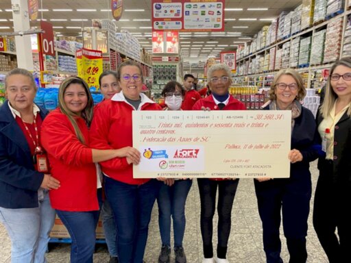 Na manhã desta sexta-feira (19) foi realizada mais uma entrega de cheque do projeto Troco Solidário Fort Atacadista, desta vez para oficializar o repasse de mais de R$ 30 mil reais à Federação das APAEs de Santa Catarina. A quantia foi arrecadada entre os meses de janeiro e junho nas lojas do Fort Atacadista em Palhoça, bem como na unidade da farmácia SempreFort anexa à loja Fort do bairro Passa Vinte. De acordo com a presidente da Federação das APAEs de SC, a senhora Alice Kuerten, que recebeu o cheque simbólico no valor de R$ 30.560,34, "a quantia será destinada para capacitação dos profissionais que trabalham nas unidades da APAE em todo o estado, atendendo as mais de 24 mil crianças e adolescentes". São, ao todo, 197 unidades da APAE no estado.