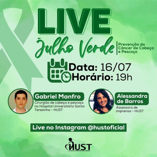 Durante todo o mês de julho a Associação de Câncer de Boca e Garganta (ACBG Brasil) e várias organizações trabalham para conscientizar a sociedade por meio da campanha Julho Verde. Trata-se de uma campanha que visa informar sobre o câncer de cabeça e pescoço, falando de promoção da saúde, prevenção, diagnóstico, tratamento e reabilitação. O hospital Universitário Santa Terezinha (HUST) abraça essa campanha e com o objetivo de informar a população sobre o tema promoverá no dia 16 de julho, às 19h, no Instagram do Hospital, uma Live sobre o tema.