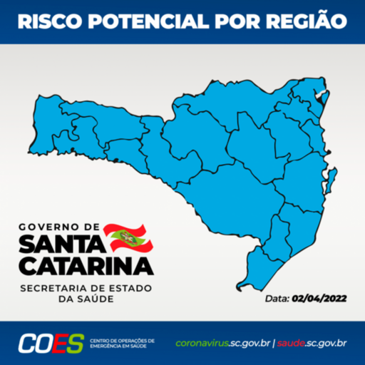 A matriz de risco potencial regionalizado divulgada neste sábado, 02, aponta todas as 17 regiões de saúde classificadas no nível Moderado (cor azul): Alto Uruguai Catarinense, Alto Vale do Itajaí, Alto Vale do Rio do Peixe, Carbonífera, Extremo Oeste, Extremo Sul Catarinense, Foz do Rio Itajaí, Grande Florianópolis, Laguna, Médio Vale do Itajaí, Meio Oeste, Nordeste, Oeste, Planalto Norte, Serra Catarinense, Vale do Itapocu e Xanxerê.