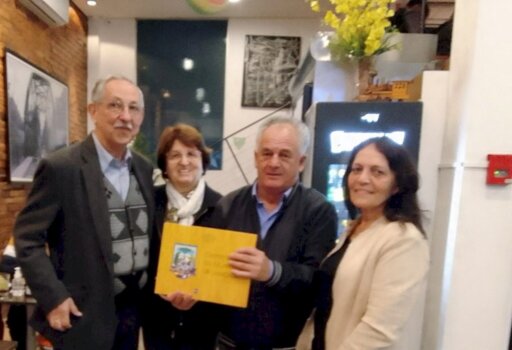 - Foto legenda: Qualquer lugar ao lado de amigos, se torna especial ! Enio e Ana agradecem ao casal Antonio Carlos Pereira e Marina pelo exemplar do município de Joaçaba, em 02/07/2022.