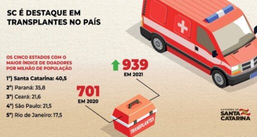 Santa Catarina foi reconhecida pela Associação Brasileira de Transplantes de Órgãos como o estado com maior número de doações efetivas de órgãos para transplantes em 2021. É a 13ª vez nos últimos 17 anos que o estado é destaque nacional na área. Nos outros quatro anos, ficou em segundo, atrás apenas de uma unidade federativa. O Registro Brasileiro de Transplantes confirmou o primeiro lugar para SC com 40,5 doadores por milhão de população (pmp), seguido por Paraná com 35,8 doadores pmp e Ceará e São Paulo - com cerca de 21 doadores pmp cada.