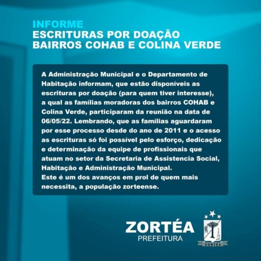 A Administração Municipal e o Departamento de Habitação informam, que estão disponíveis as escrituras por doação (para quem tiver interesse), a qual as famílias moradoras dos loteamentos COHAB e Colina Verde, participaram da reunião na data de 06/05/22. Lembrando, que as famílias aguardaram por esse processo desde 2011 e o acesso as escrituras só foi possível pelo esforço, dedicação e determinação da equipe de profissionais que atuam no setor da Secretaria de Assistência Social, Habitação e Administração Municipal. Este é um dos avanços em prol de quem mais necessita: a população zorteense.