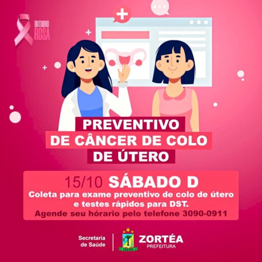 Atenção mulheres: a Prefeitura de Zortéa, por meio da Secretaria Municipal de Saúde, promove no dia 15 de outubro o SÁBADO D exames preventivos do câncer do colo de útero, e testes rápidos. Os exames serão realizados das 8h às 16h30 no Centro do Idoso Seu Tucho. Agende seu horário pelo telefone: 3090-0911.