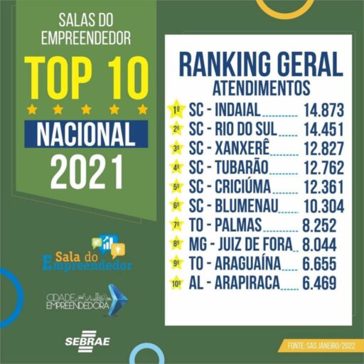 A Sala do Empreendedor de Xanxerê, no oeste catarinense, conquistou a terceira posição no ranking Top 10 Nacional de 2021, com 12.827 atendimentos observados no período de janeiro a dezembro do ano passado. O levantamento é realizado pelo Sistema de Atendimento Sebrae e busca os melhores serviços e empreendedorismo empresarial, o fomento ao melhoramento do ambiente de negócios.
