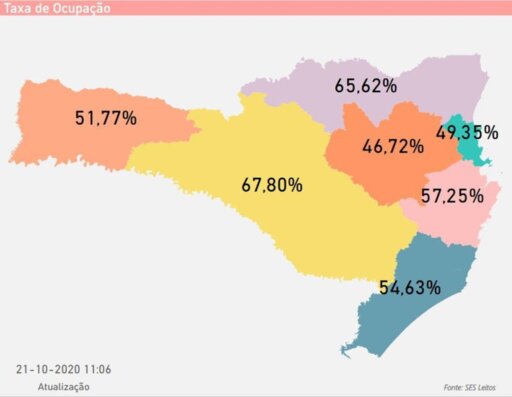 Reprodução/SES Leitos - Taxa de ocupação de leitos de UTI da rede pública por região catarinense