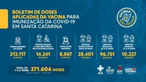 Do total de doses aplicadas, 280.220 correspondem à primeira dose (D1) e 91.384 à segunda (D2). O balanço é elaborado pela Diretoria de Vigilância Epidemiológica (Dive) com informações fornecidas pelos municípios catarinenses.
