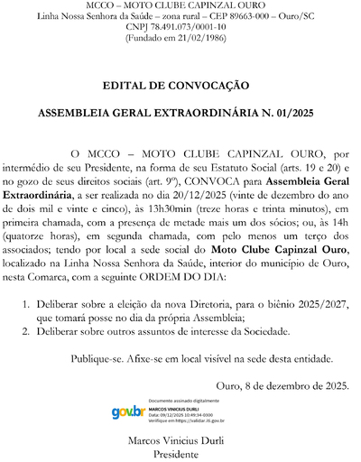 intermédio de seu Presidente, na forma de seu Estatuto Social (arts. 19 e 20) e no gozo de seus direitos sociais (art. 9º), CONVOCA para Assembleia Geral Extraordinária, a ser realizada no dia 20/12/2025 (vinte de dezembro do ano de dois mil e vinte e cinco), às 13h30min (treze horas e trinta minutos), em primeira chamada, com a presença de metade mais um dos sócios; ou, às 14h (quatorze horas), em segunda chamada, com pelo menos um terço dos associados; tendo por local a sede social do Moto Clube Capinzal Ouro,