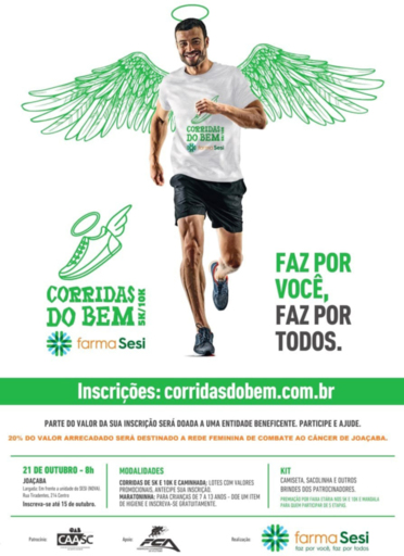 Promovido pela FarmaSESI, o evento propõe unir o incentivo à cultura esportiva e prática de fazer o bem. Por isso, parte do valor das inscrições é revertida para uma instituição de amparo social, esse ano beneficiando a Rede Feminina de Combate ao Câncer de Joaçaba.