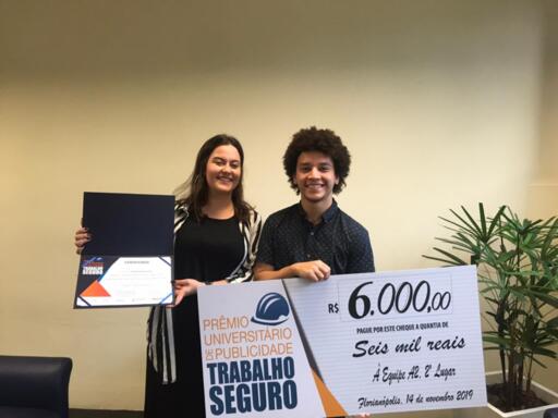 Os acadêmicos do Curso de Publicidade e Propaganda, Samuel Marques Pedroso e Lolita Mafra Alves Neta, sob a orientação da professora Vanessa Balestrin conquistaram o 2º lugar no "Prêmio Universitário de Publicidade Trabalho Seguro" promovido Tribunal Regional do Trabalho de Santa Catarina (TRT). Eles estiveram participando nesta quinta-feira, 14, da cerimônia e premiação no Auditório do TRT em Florianópolis.