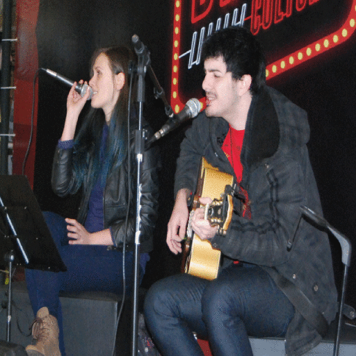 Levi Garcia, que trabalha da Unoesc FM, e Eduarda de Oliveira Santos, que cursa Publicidade e Propaganda, são integrantes da banda Super Drops, de Joaçaba, e foram os primeiros a usar o palco montado no Centro de Convivência do Campus II para uma apresentação acústica de aproximadamente 30 minutos que ocorreu no intervalo da aula, hoje pela manhã. À noite, às 21h, eles voltaram a se apresentar, mas desta vez para animar o intervalo de quem estuda no Campus I.