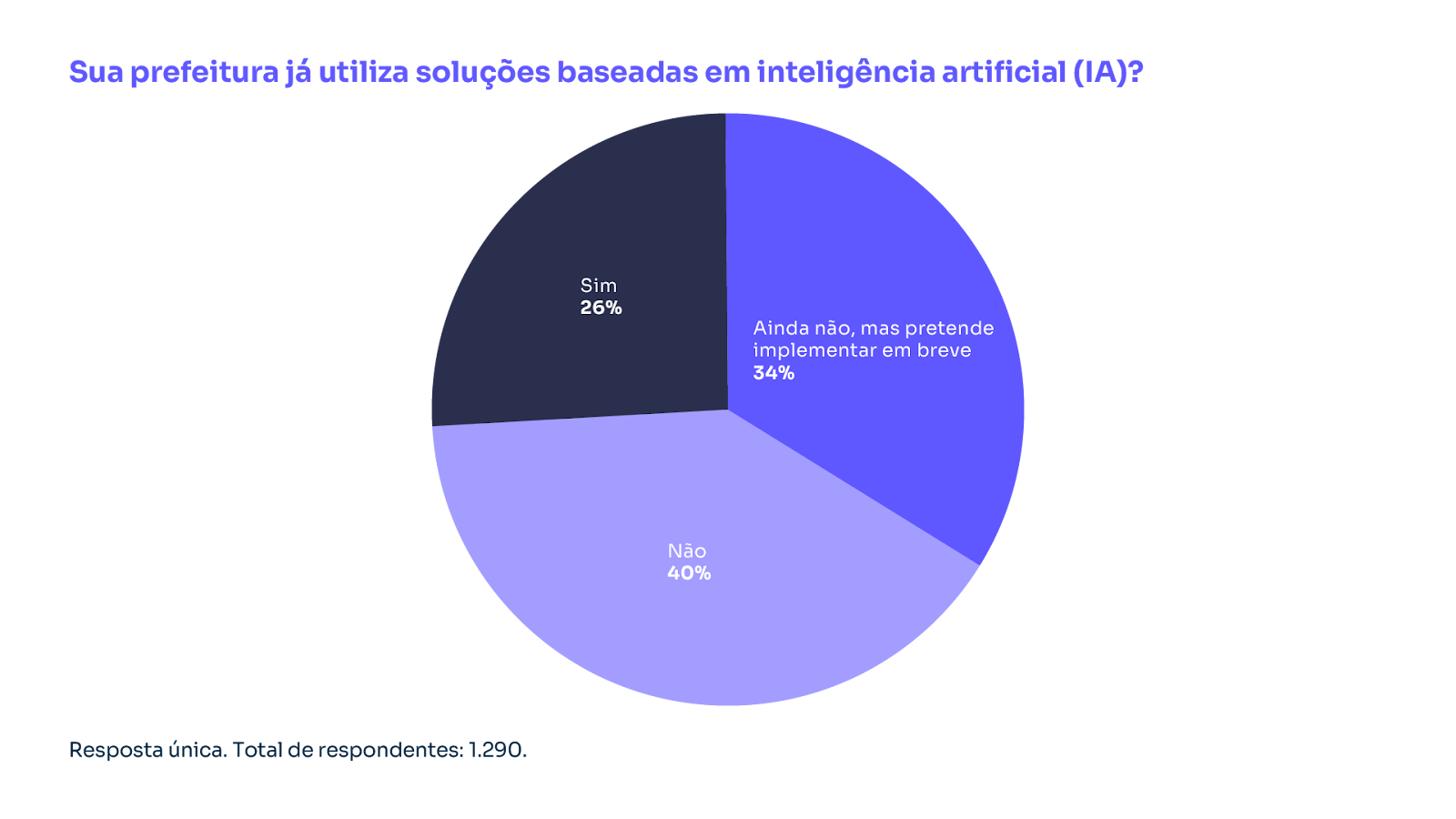 Inteligência artificial começa a ganhar espaço Apesar do debate crescente sobre IA no setor público, apenas 26% das prefeituras já utilizam soluções baseadas em inteligência artificial. Outras 34% pretendem implementar em breve, enquanto 44% ainda não têm planos definidos. Entre os municípios que já utilizam IA, as aplicações mais comuns são na gestão documental e análise de processos (26%), no atendimento ao cidadão (23%) e na comunicação institucional (21%).