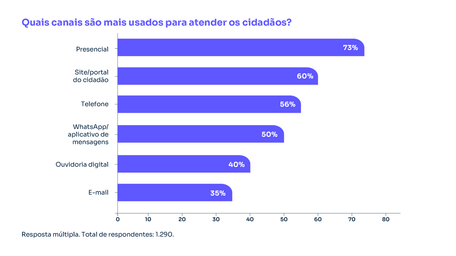 Atendimento ao cidadão O atendimento ao cidadão aparece como uma das maiores prioridades da gestão municipal para 2026, mas também como uma das áreas mais difíceis de digitalizar. A satisfação média percebida pelos servidores é de 3,72 em uma escala de 1 a 5. O atendimento presencial ainda predomina (73%), seguido por portais digitais (60%), telefone (56%) e WhatsApp (50%). O desafio, segundo os respondentes, não está na falta de canais, mas na integração entre eles, o que impacta agilidade, padronização e experiência do cidadão.