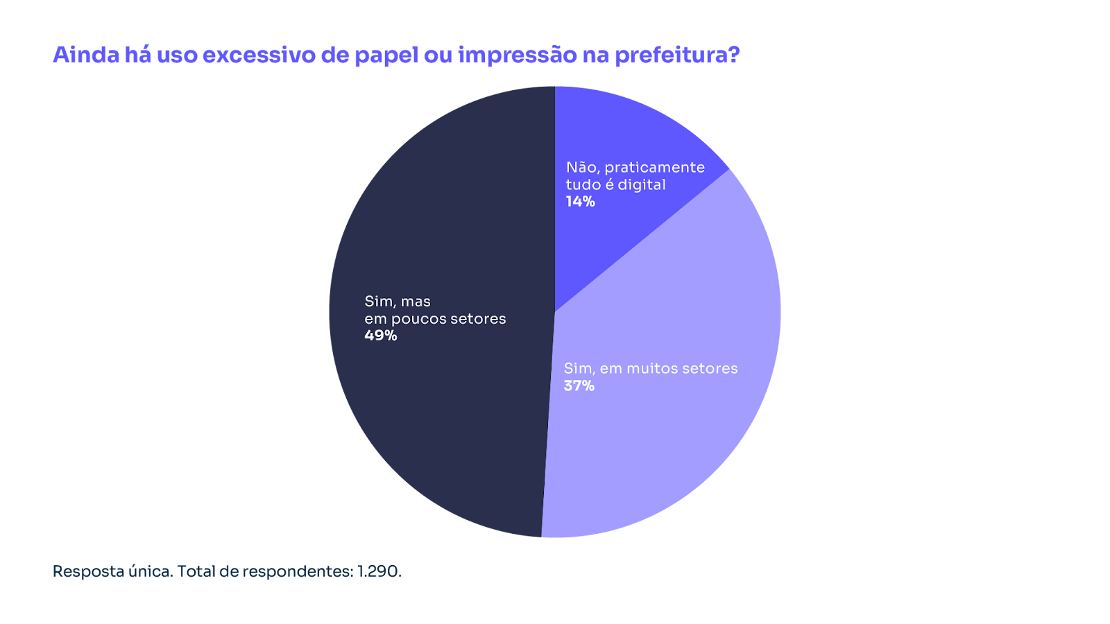 Domínio do papel O uso do papel permanece como um dos principais símbolos da lentidão administrativa. Apenas 14% das prefeituras afirmam operar de forma praticamente 100% digital e 49% ainda utilizam papel em poucos setores. E uso intenso em muitos setores está em 37% dos governos municipais. Os impactos são mensuráveis. Prefeituras com uso excessivo de papel enfrentam 22,4 pontos percentuais a mais de problemas com processos morosos, 58% de dificuldades na gestão documental e 52% de problemas de integração entre áreas.