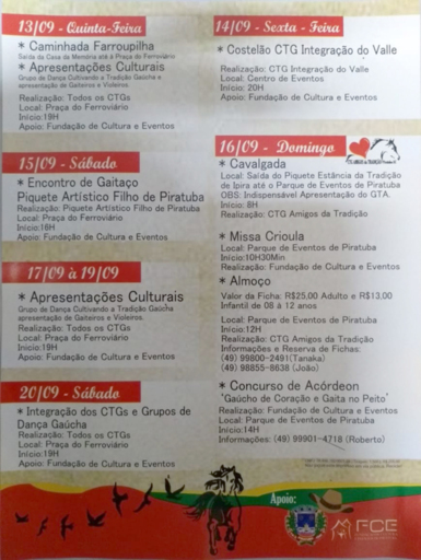 Obs.: Confira a programação completa da Semana Farroupilha de Piratuba no folder que segue anexo.
