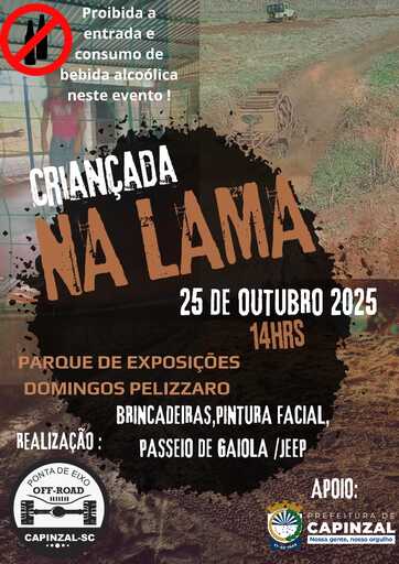 No dia 25 de outubro, a partir das 14h, o Parque de Exposições Domingos Pellizzaro será palco do Criançada na Lama, um evento cheio de brincadeiras, pintura facial, brinquedos infláveis, distribuição gratuita de pipoca e algodão doce, além de passeio de gaiola e Jeep que vão garantir a animação da tarde!
