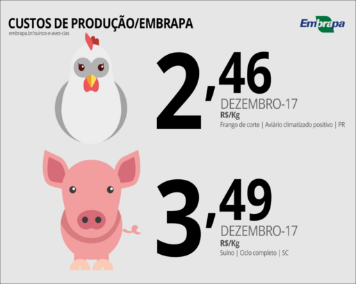 ICP/Embrapa - Os índices de custos de produção foram criados em 2011 pela equipe de socioeconomia da Embrapa Suínos e Aves e Conab. O ICPFrango/Embrapa refere-se aos custos de produção no Paraná para aviário tipo climatizado em pressão positiva, modelo referencial de produção. Já o ICPSuíno/Embrapa é obtido a partir de resultados de custos da produção de suínos em sistema ciclo completo em Santa Catarina.