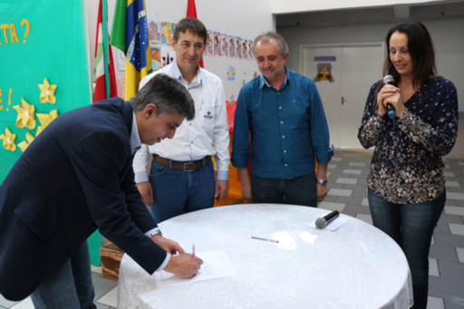 Assinatura ocorreu no pátio da escola, nesta quarta-feira, 18. Empresa tem prazo de quatro meses para a entrega da obra.