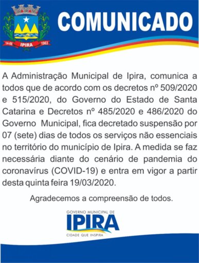 A Administração Municipal de Ipira, comunica a todos que de acordo com os decretos nº 509/2020 e 515/2020, do Governo do Estado de Santa Catarina e Decretos nº 485/2020 e 486/2020 do Governo Municipal, fica decretada a suspensão por 07 (sete) dias de todos os serviços não essenciais no território do Município de Ipira. A medida se faz necessária diante do cenário de pandemia do Coronavírus (COVID-19) e entra em vigor a partir desta quinta-feira 19/03/2020.