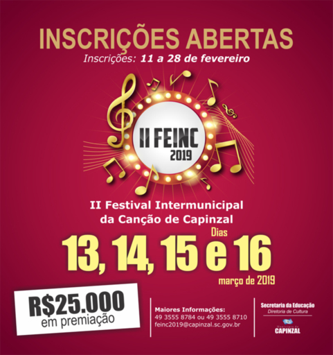 O II Festival Intermunicipal da Canção (FEINC) será uma das atrações da programação dos 70 anos de emancipação político-administrativa de Capinzal. O evento está sendo organizado pela Secretaria Municipal da Educação, Cultura e Esportes e estará sob a coordenação da Diretoria de Cultura e da Escola Municipal de Música.