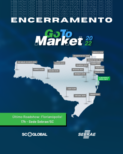 A Gerência de Negócios Internacionais do Sebrae/SC, por meio do programa Go To Market, promove no dia 8 de dezembro, às 17h, o encerramento do programa e abertura do ciclo 2023. Serão apresentados os principais resultados deste ano, e informações sobre o ciclo 2023 do Programa, que é destinado para os empresários que têm interesse na área de negócios internacionais. As inscrições são gratuitas e podem ser realizadas em sebrae.sc/roadshow-florianopolis3.