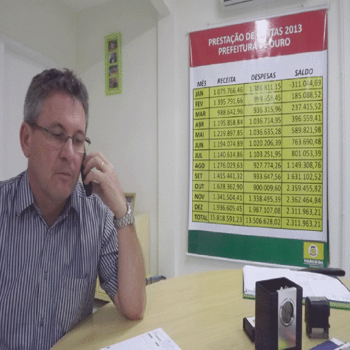 Foto legenda: Prefeito do município de Ouro, Vitor João Faccin e no detalhe, prestação de contas 2013, referente aos 12 meses, receitas, despesas e saldo. Quando o atual Governo em 2013 assumiu os destinos de Ouro e sua gente, a Prefeitura apresentava um saldo negativo de R$ 311.044,69, no entanto, dezembro do mesmo ano, o resultado foi positivo, de R$ 2.2311963,21. A prestação de contas do exercício 2013 será exposta na segunda-feira, 10 de Fevereiro, na Praça Pio XII, num ato de transparência.