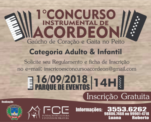 Integrando a programação da Semana Farroupilha de Piratuba, será realizado no dia 16 de setembro (um domingo), às 14h, no Parque de Eventos, o Primeiro Concurso Instrumental de Acordeon "Gaúcho de Coração e Gaita no Peito", categorias Infantil (até 12 anos) e Adulta (acima de 12 anos).