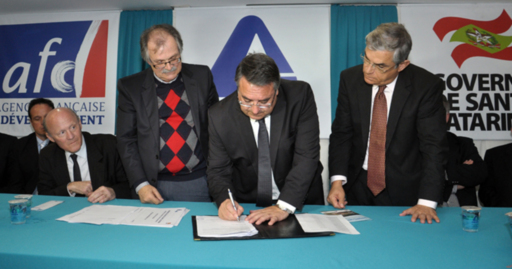 Financiamento internacional entre o Governo do Estado, por meio da Companhia Catarinense de Águas e Saneamento (CASAN), e a Agência Francesa de Desenvolvimento (AFD) vai garantir o investimento de R$ 270 milhões em obras de saneamento sanitário em 12 cidades de Santa Catarina, beneficiando uma população de 330 mil pessoas. O governador Raimundo Colombo e o presidente da CASAN, Dalírio Beber, assinaram nesta quarta-feira, 31, o contrato de garantia do financiamento internacional de R$ 253 milhões – a contrapartida do Estado será de R$ 17 milhões.