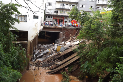 Pequena edificação e parte do piso de posto de combustível desaba no leito do Rio Capinzal