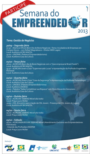 A Administração Municipal, através da Secretaria de Indústria Comércio e Turismo, promove de 30 de Setembro a 05 de Outubro a Semana do Empreendedor 2013, com o tema “Gestão de Negócios”.