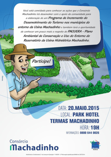 Em atendimento a Condicionante 2.1 da Licença de Operação n° 160/2001 – 2ª renovação, o Consórcio Machadinho desenvolverá em parceria com a comunidade lindeira o Programa de Incremento do Desenvolvimento do Turismo dos Municípios da AID da UHE Machadinho. Palestras e oficinas sobre turismo serão oferecidas as prefeituras e entidades especializadas com o propósito de desenvolver o programa de turismo junto ao lago da Usina Hidrelétrica Machadinho – Carlos Ermírio de Moraes.