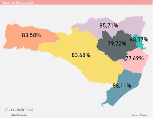 Reprodução/SES Leitos - Taxa de ocupação de leitos de UTI da rede pública por região catarinense