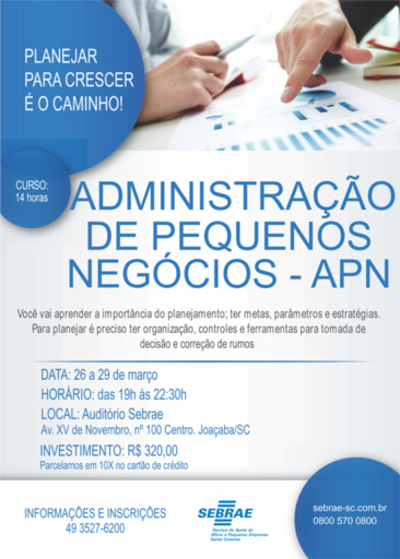 Joaçaba- As inscrições para o curso "Administração de Pequenos Negócios - Planejar para Crescer é o caminho, que o Sebrae realizará de 26 a 29 de março já estão abertas. O curso terá início às 19 horas no auditório do Sebrae em Joaçaba. A coordenadora regional do Sebrae Meio- Oeste Sueli Bernardi destaca que, independentemente do tamanho da empresa, é necessário estabelecer metas, parâmetros e estratégias. "É importante ter um guia, um plano que direcione as ações", afirma.