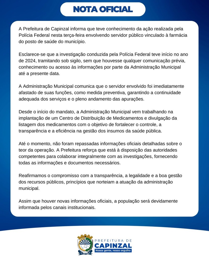 O preso, servidor público, é o farmacêutico responsável pela unidade de saúde do município de Capinzal. A esposa dele também é alvo da PF.