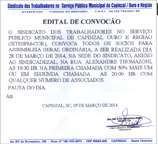 O Sindicato dos Trabalhadores no serviço Público municipal de Capinzal Ouro e região (SITESPM-COR), convoca todos os sócios para Assembléia Geral Ordinária, a ser realizada dia 28 de março de 2014, na sede do Sindicato, anexo ao Sindicadezal, na rua Alexandre Thomazoni, as 19:30 hr na primeira chamada com 50% mais um ou em segunda chamada as 20:00 hr com qualquer número de associados.