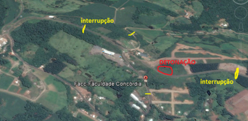A Secretaria de Estado de Infraestrutura (SIE), comunica que o Consórcio Seta-Tucumann estará realizando a operação de detonações de rochas no Contorno Viário Norte de Concórdia. Serão efetuadas duas detonações, uma ocorrendo na quinta-feira, 5, no Km 8 próximo a Faculdade Concórdia (Facc), no lado direito da pista. A outra acontece na sexta-feira, 6, no Km 5 próximo ao Vip Motel, no lado esquerdo da pista.