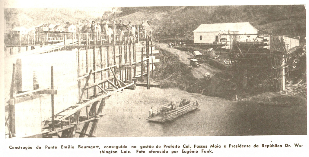 No ano de 1929 foi lançada simbolicamente a pedra fundamental para a construção de uma via sobre o Rio do Peixe, marcando o início da concretização de um sonho antigo: a travessia rodoviária que uniria as margens e impulsionaria o desenvolvimento da região. Baumgart projetou e iniciou a construção da ponte, porém ao término da concretagem dos pilares uma cheia repentina deslocou as estruturas. Depois de paralisar a obra e refazer o projeto com novos cálculos e fórmulas, decidiu aplicar o concreto armado e utilizando um processo já existente resolveu o problema do desnível entre as duas extremidades em balanço projetando a ponte em curva U, prevendo o aumento gradativo das águas do rio.