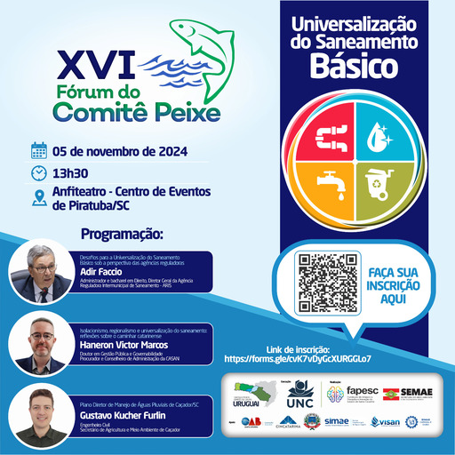 Universidade do Saneamento Básico Terça-feira - 05 de novembro de 2024 13h30 - Anfiteatro - Centro de Eventos de Piratuba/SC