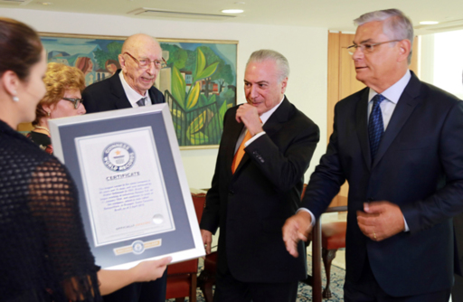 O trabalhador de Brusque, Walter Orthmann, reconhecido pelo livro dos recordes como o homem de maior tempo de serviço em uma mesma empresa recebeu, nesta quarta-feira, 2, em Brasília, das mãos do governador Eduardo Pinho Moreira e do presidente da República, Michel Temer, o certificado oficial do Guinness World Records. A entrega do título ocorreu no gabinete da presidência, no Palácio do Planalto, e referendou a dedicação de 80 anos do catarinense empregada na indústria especializada em tecidos.