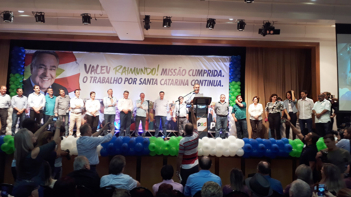 Já no discurso frente ao público, elevou o tom sobre a definição do verdadeiro político e o papel que ele precisa desenvolver na arte de liderar. Lembrou que muitos podem aprovar ou reprovar o seu governo, mas que nenhum catarinense desaprova o Estado de Santa Catarina. Mencionou Luiz Henrique da Silveira, enaltecendo a longa amizade que existiu entre eles, e tocou na ferida sobre a aliança que o beneficiou para chegar ao Senado e nos dois governos, afirmando que eles (MDB), não falharam, e que é preciso respeitar àqueles que estiveram juntos, muito embora os caminhos de agora levam para uma nova aliança, uma nova composição. No final ratificou a intenção ser candidato ao Senado.